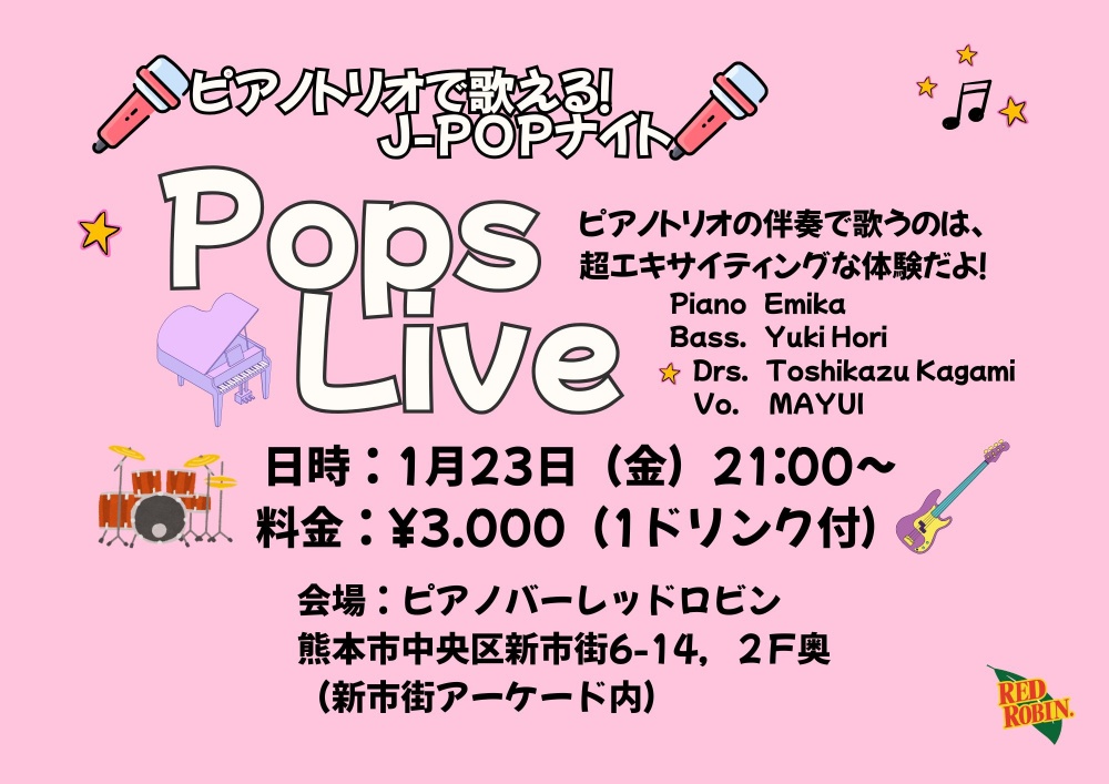 | ☆ポップスライブ | 〜 ピアノトリオをバックに、あなたがボーカル! 〜 開催日時:三カ月に一回開催 (次回は2026年 4月予定(金) 21:00〜) 料金:¥3,000(1ドリンク付き) ホスト:MAYUI(Vo)、エミカ(Pf)、堀 祐希(Ba) 【内容】 各ステージ前半はMAYUIのライブ、後半はお客様がバンドをバックに歌える参加型ライブです。 ※歌唱希望の方は、HP内の「[今月の演奏曲リスト]」から曲をお選びください。 |